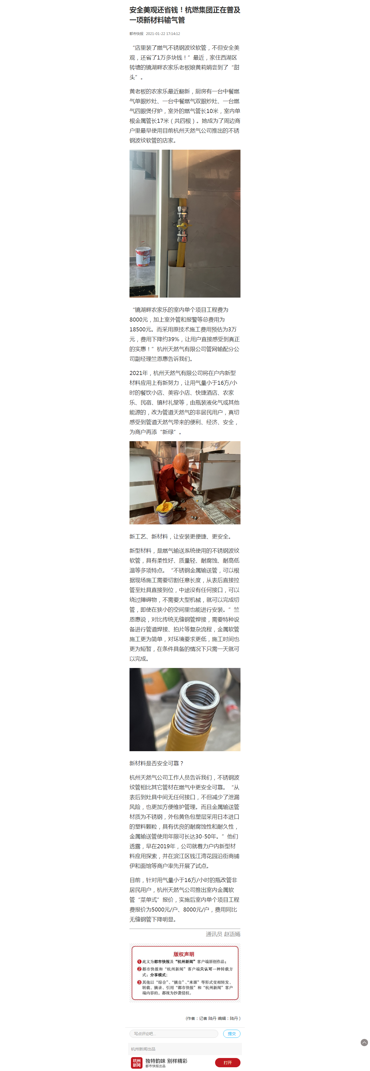杭州天然气公司工作人员告诉我们,不锈钢波纹管相比其它管材在燃气中更安全可靠。“从表后到灶具中间无任何接口,不但减少了泄漏风险,也更加方便维护管理。而且金属输送管材质为不锈钢,外包黄色包塑层采用日本进口的塑料颗粒,具有优良的耐腐蚀性和耐久性,金属输送管使用年限可长达30-50年。”他们透露,早在2019年,公司就着力户内新型材料应用探索,并在滨江区钱江湾花园沿街商铺伊和面馆等商户率先开展了试点。