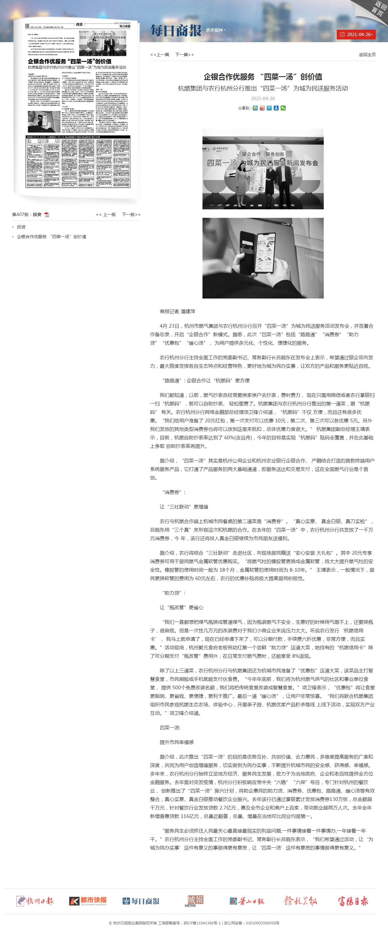 4月23日,杭州市银河官网 与农行杭州分行召开“四菜一汤”为城为民送服务活动发布会,并签署合作备忘录,开启“企银合作”新模式。据悉,此次“四菜一汤”包括“路路通”“消费券”“助力贷”“优惠包”“暖心汤”,为用户提供多元化、个性化、便捷化的服务。