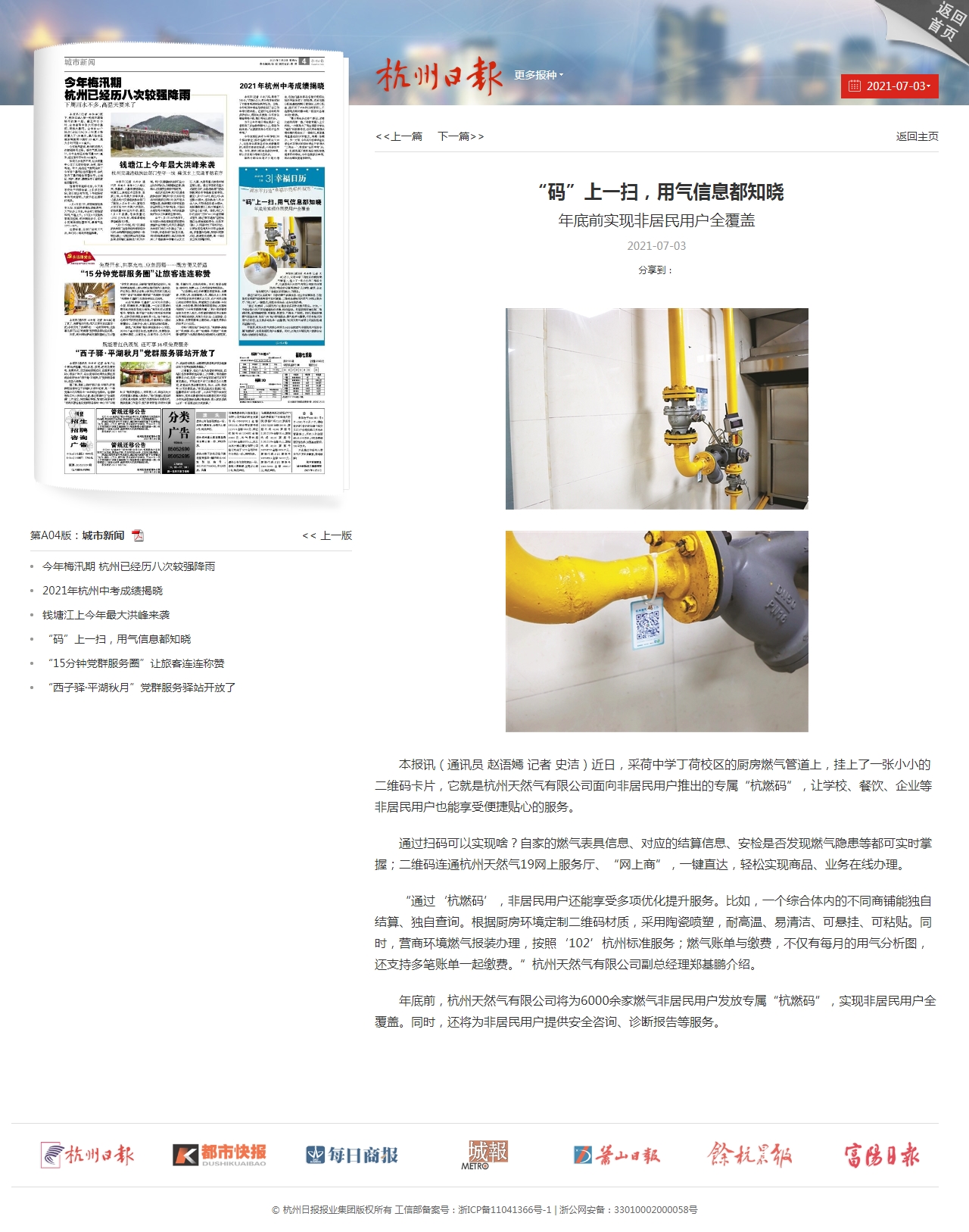 年底前,杭州天然气有限公司将为6000余家燃气非居民用户发放专属“银河 码”,实现非居民用户全覆盖。同时,还将为非居民用户提供安全咨询、诊断报告等服务。