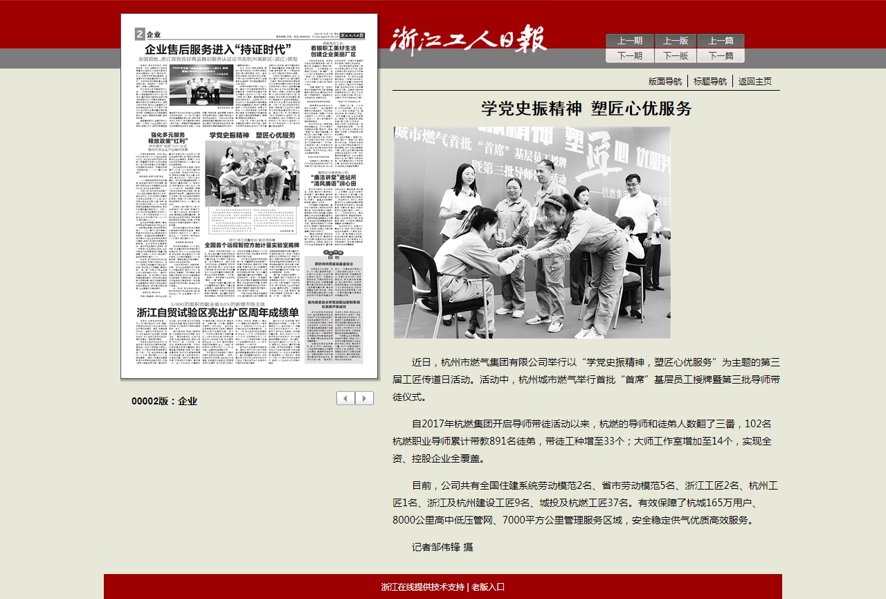 近日,杭州市银河官网 有限公司举行以“学党史振精神,塑匠心优服务”为主题的第三届工匠传道日活动。活动中,杭州城市燃气举行首批“首席”基层员工授牌暨第三批导师带徒仪式。