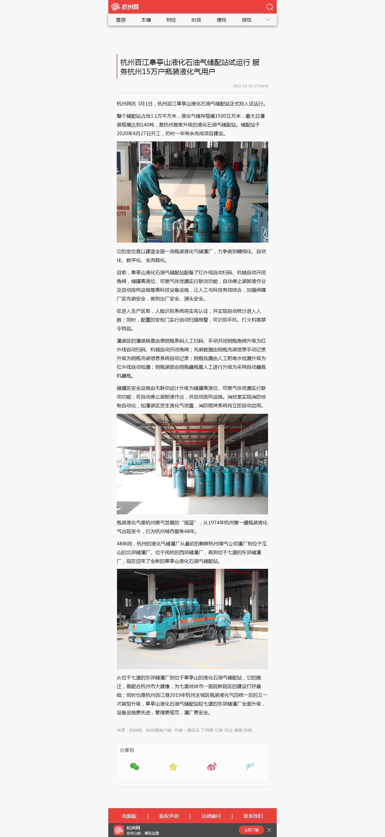 杭州网讯 3月1日,杭州百江皋亭山液化石油气储配站正式投入试运行。