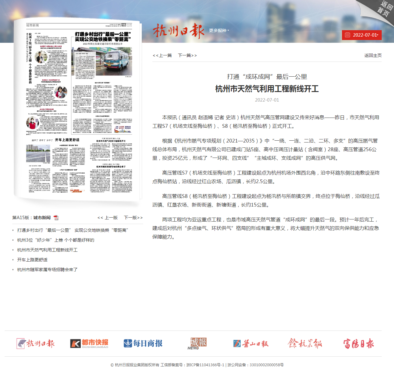 两项工程均为亚运重点工程,也是市域高压天然气管道“成环成网”的最后一段。预计一年后完工,建成后对杭州“多点接气、环状供气”格局的形成有重大意义,将大幅提升天然气的双向保供能力和应急保障能力。