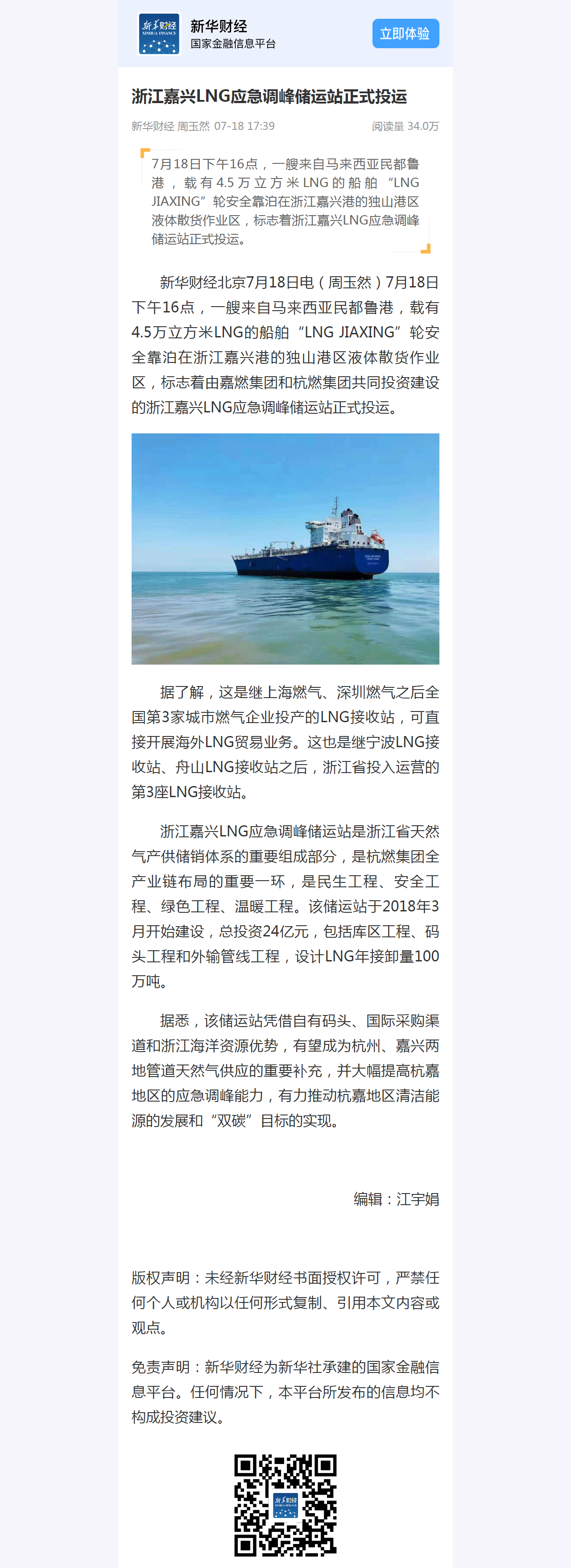 新华财经北京7月18日电(周玉然)7月18日下午16点,一艘来自马来西亚民都鲁港,载有4.5万立方米LNG的船舶“LNG JIAXING”轮安全靠泊在浙江嘉兴港的独山港区液体散货作业区,标志着由嘉燃集团和银河官网 共同投资建设的浙江嘉兴LNG应急调峰储运站正式投运。