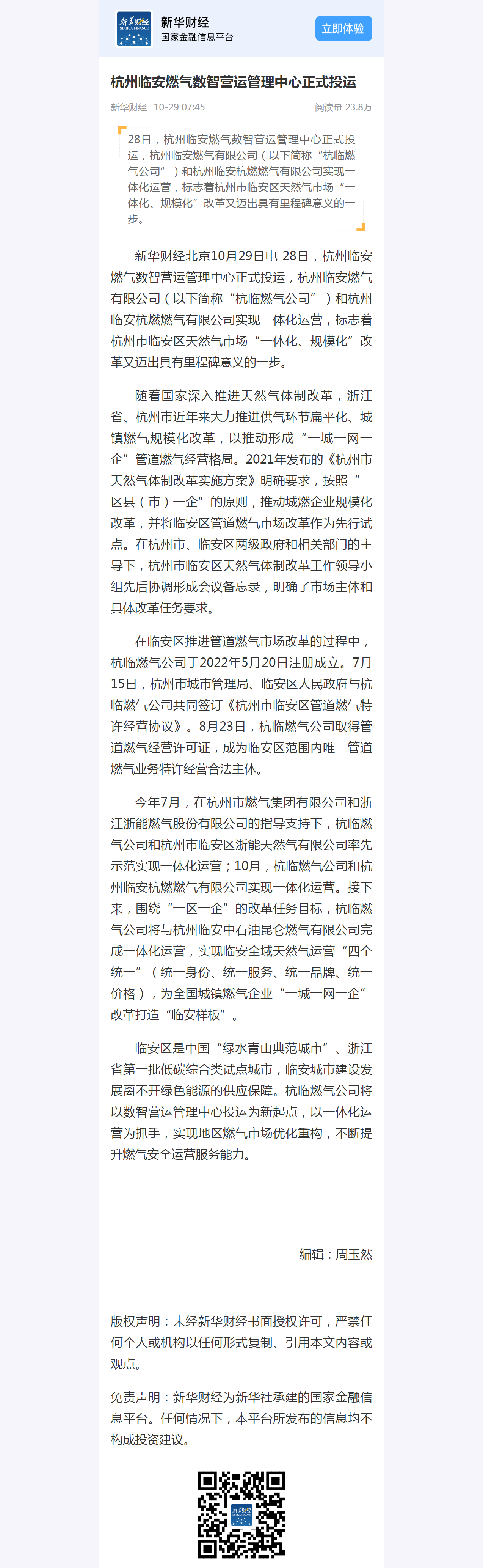 燃气有限公司实现一体化运营,标志着杭州市临安区天然气市场“一体化、规模化”改革又迈出具有里程碑意义的一步。