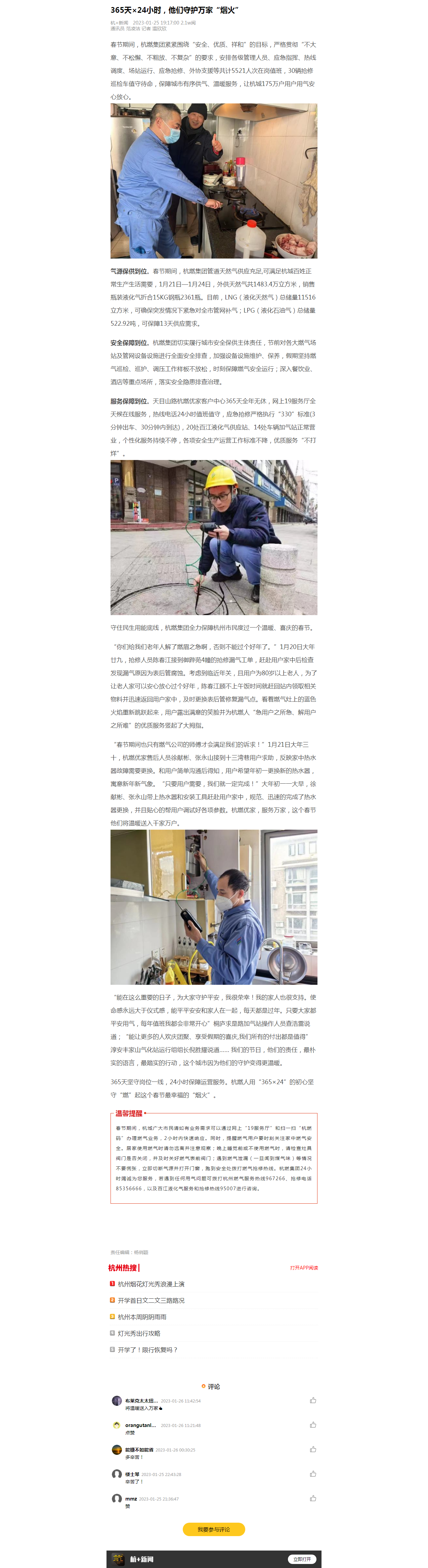 紧紧围绕“安全、优质、祥和”的目标,严格贯彻“不大意、不松懈、不粗放、不复杂”的要求,安排各级管理人员、应急指挥、热线调度、场站运行、应急抢修、外协支援等共计5521人次在岗值班,30辆抢修巡检车值守待命,保障城市有序供气、温暖服务,让杭城175万户用户用气安心放心。
