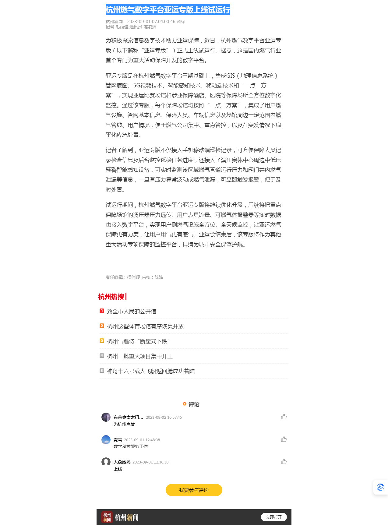 数字平台亚运专版(以下简称“亚运专版”)正式上线试运行。据悉,这是国内燃气行业首个专门为重大活动保障开发的数字平台。