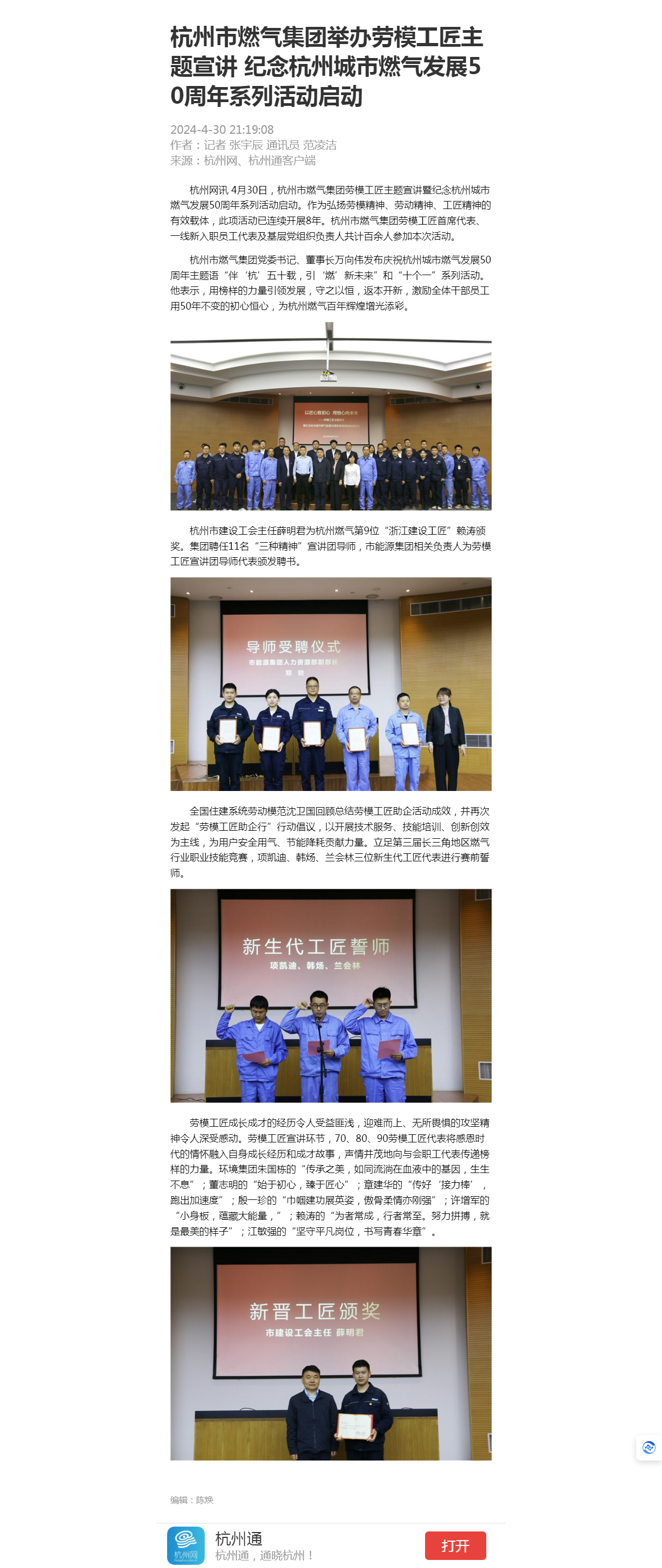 杭州网讯 4月30日,杭州市银河官网 劳模工匠主题宣讲暨纪念杭州城市燃气发展50周年系列活动启动。作为弘扬劳模精神、劳动精神、工匠精神的有效载体,此项活动已连续开展8年。杭州市银河官网 劳模工匠首席代表、一线新入职员工代表及基层党组织负责人共计百余人参加本次活动。