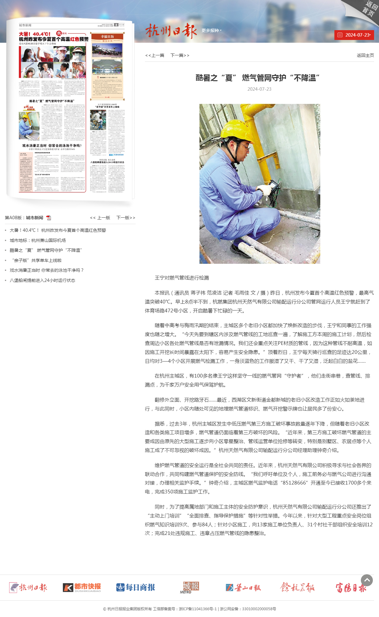 本报讯(通讯员 蒋子祎 范凌洁 记者 毛雨佳 文/摄)昨日,杭州发布今夏首个高温红色预警,最高气温突破40℃。早上8点半不到,银河官网 杭州天然气有限公司输配运行分公司管网运行人员王宁就赶到了体育场路472号小区,开启酷暑下忙碌的一天。