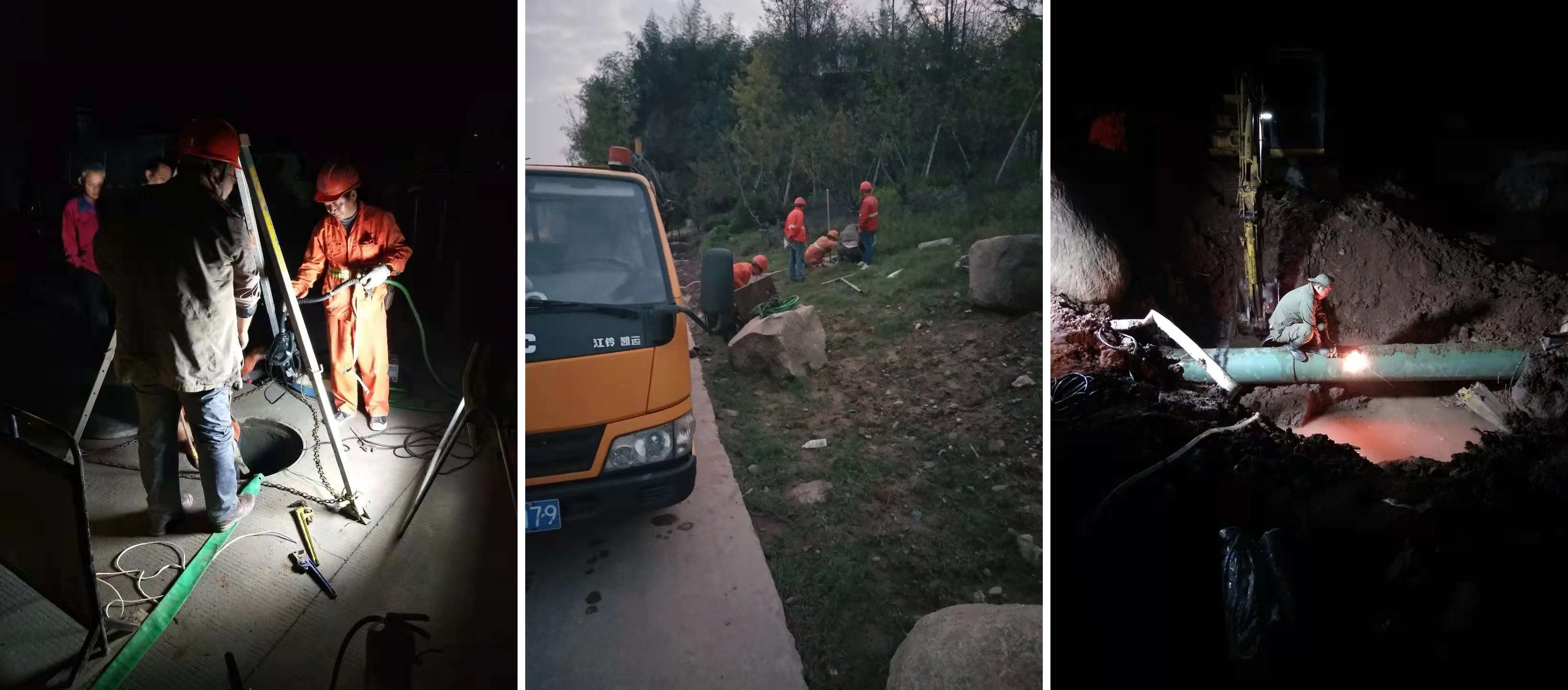 当日正值霜降时节,昼夜温差大,丝丝细雨淋在衣服上,衣袖间夹杂着汗水与雨水,输配运行人员和施工员们不畏辛苦,持续作战11个小时,终于在次日凌晨5时顺利完成了主干管迁改工作,并恢复正常通气。