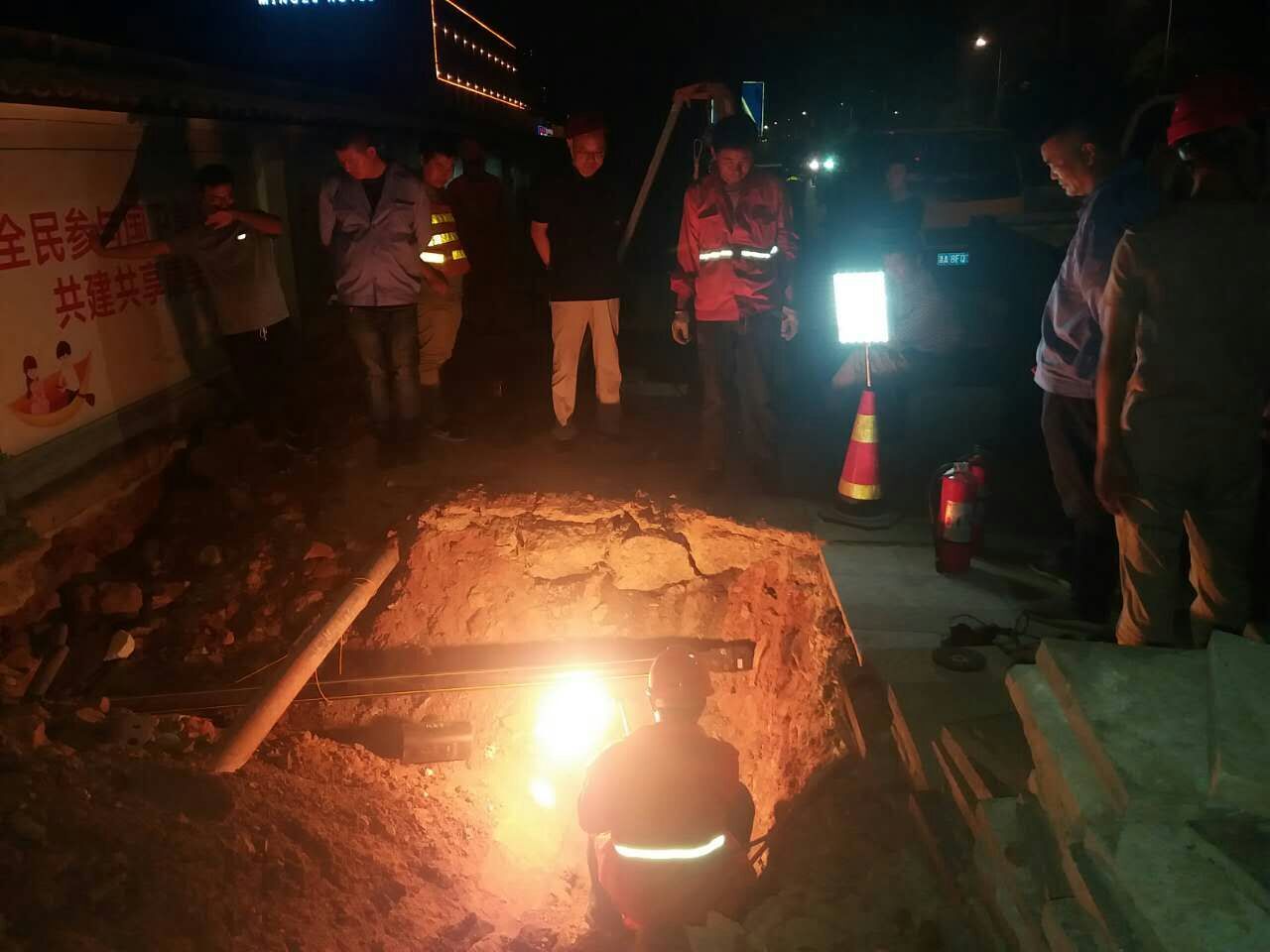 公司服务发展部门按规定提前通知睦洲大道公建用户和居民用户停气并张贴了停气通告。本次拆改涉及割接点4处、开三通1处,涉及管线890米。工作量较大,是淳安公司成立来首次新老管线割接,公司领导于下午17:00组织相关人员明确任务,落实专人检查安全设备是否到位并使用、专人负责开关阀门、检测放散浓度、碰接点查漏等工作。19:30在客运中心加气站对此次工程公司全体施工人员进行安全交底,对割接过程中需要注意的事项提出要求,同时要求务必做到听从现场管理人员指挥,开工前对施工人员进行高温慰问并送上慰问品。20:30割接作业正式开始,淳安公司巡检员关闭涉及改造区域阀门,放散后施工人员插盲板吹扫,在末端浓度检测合格后由施工员周伟下令割接作业开始。